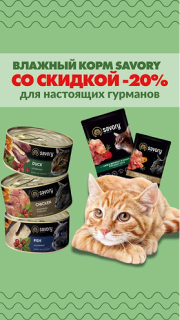 Порадуйте своего любимца вкусным и полезным кормом Savory. Только сейчас — скидка 20% на влажный корм для настоящих гурманов! Успейте порадовать котика заботой и вкусняшками.