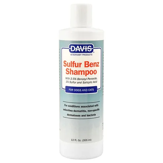Шампунь Davis Sulfur Benz для собак і котів з пероксидом бензоїлу, сіркою та саліциловою кислотою — ефективний засіб для догляду за шкірою тварин із себорейним дерматитом, дерматозами, бактеріальними та паразитарними інфекціями. Використовується при проблемах з шкірними складками та станах, що потребують знежирюючої або кератолітичної формули.