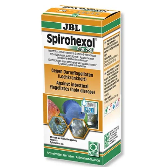 JBL Spirohexol Plus 250 — эффективное лекарство для аквариумных рыб против жгутиковых (например, Hexamita) и дырочной болезни. Препарат содержит активные вещества, направленные на уничтожение патогенных микроорганизмов и восстановление здоровья рыб. Подходит для всех видов пресноводных декоративных рыб.