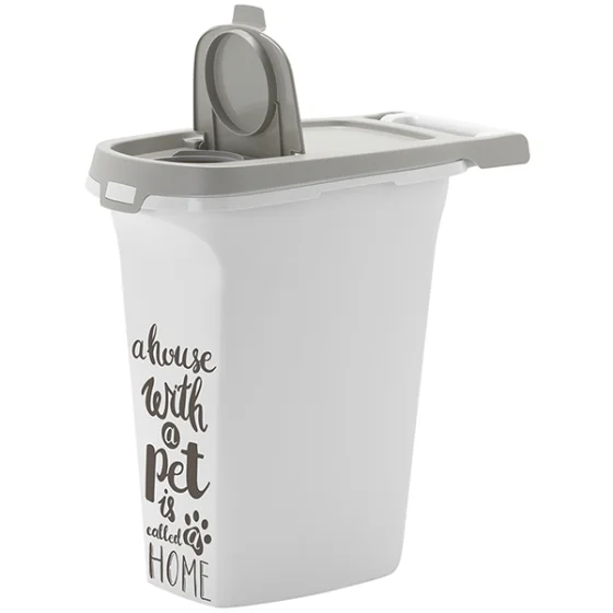 Модель представлена в пяти вариантах объема: 5, 6, 10, 20, 38 л. В контейнерах объемом 5, 6 и 10 литров откидная крышка имеет 2 уровня открытия: полное вертикальное для заполнения контейнера кормом и небольшое для ежедневного использования. Все крышки фиксируются защелками.