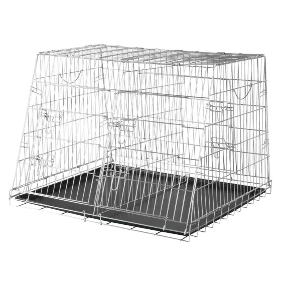 Двухместная клетка Trixie для собак, сделана из гальванизированного металла и имеет три двери и пластиковое дно. Благодаря скошенной передней стороне предоставляется возможность рационально использовать место в багажнике. Предусмотрен съёмный разделитель. Конструкция клетки разборная, что упрощает её хранение.