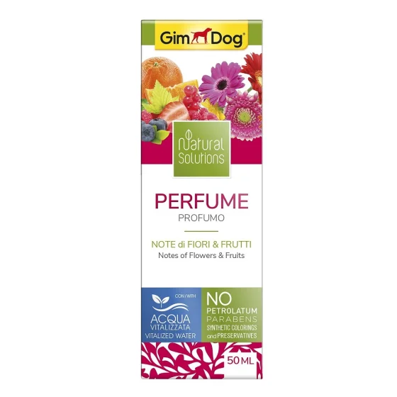 Парфюм GimDog Natural Solutions – безопасный аромат для собак с нежными нотками цветов и фруктов. Придает шерсти приятный свежий и фруктово-цветочный аромат, не раздражает кожу и дыхательные пути, подходит для регулярного использования после купания или для освежения шерсти в любое время.