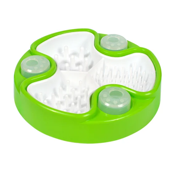 Миски медленного питания – это миски для собачьего корма, в которых встроено препятствие. Помогает животному не проглатывать наспех пищу, что может приводить к рвоте, диарее и проблемам с пищеварением. Также помогает собакам, имеющим нервные расстройства, из-за отсутствия владельцев рядом, отвлекаться и приучаться к нахождению дома в одиночестве. Силиконовая вкладка вынимается, и миска преобразуется в обычную классическую миску. Также миска имеет 3 пластмассовых «укрытия», в которые можно прятать корм или лакомство, превращая обычное питание в интересную игру.