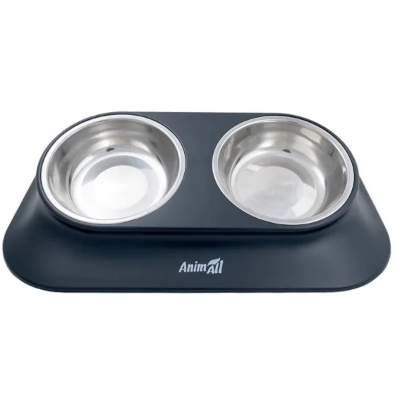 Миска двойная AnimAll для собак и кошек, на подставке, металл/пластик, 420 мл, чёрная