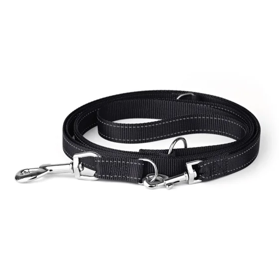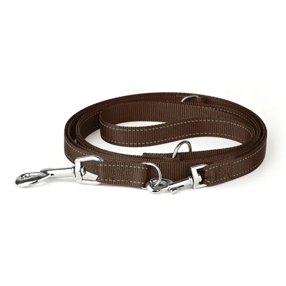 Особое внимание заслуживает функциональность застежки благодаря украшению дополнительной фурнитурой она превращается в поводок "6 в 1": длинный или короткий поводок, длинная или короткая привязь, поводок "hands free", когда заняты обе руки, поводок-петля для прогулок с двумя собаками.