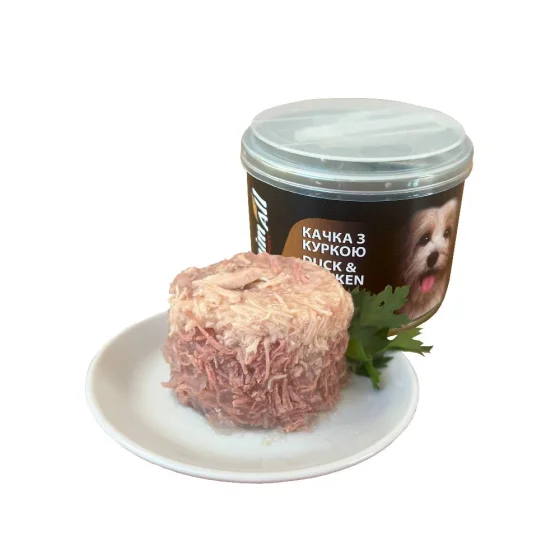 Наш консервированный корм для собак со свежим мясом утке и курицы – это настоящее удовольствие для вашего любимца.