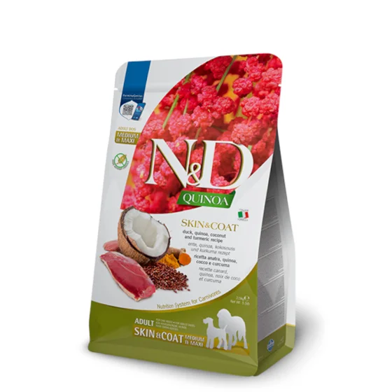 Здоровье кожи и шерсти. Утка, киноа, кокос и куркума. ND Quinoa Skin Coat - Coat - полнорационный диетический сухой корм для взрослых собак, рекомендуемый при пищевой непереносимости.