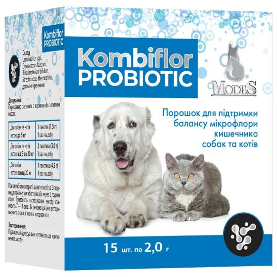 Modes Kombiflor Probiotic – пробиотик для поддержания баланса микрофлоры кишечника собак и кошек, 15 пакетиков × 2 г – эффективный комплекс для поддержания здоровой микрофлоры кишечника у собак и кошек. Способствует нормализации пищеварения, укреплению иммунитета и восстановлению после стрессов, антибиотикотерапии или смены рациона.