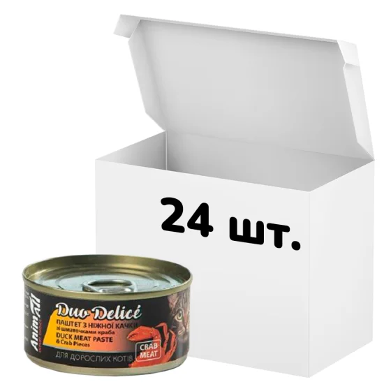 Упаковка консервов AnimAll Duo Delice для кошек, паштет из утки с кусочками краба, 80 г, 24 штуки
