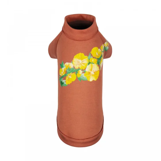 Глубокий и насыщенный цвет ткани как бы дарит ощущение тепла, а украшающие модель мальвы согреют душу и будут оберегом для вашего любимца. Ведь издавна мальвы были символом верности традициям предков и оберегали от беды посадивших их людей. Сочетание самых актуальных цветов сезона делает свитшот стильным нарядом для четырехлапых модниц.