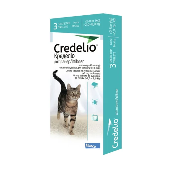 Таблетки Elanco Кределио Кэт от блох и клещей, для кошек весом 2-8 кг, 3 таблетки 48 мг, упаковка