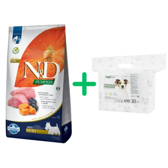 Беззерновой сухой корм Farmina N&D, для собак мелких пород, ягненок с тыквой и черникой, 7 кг + Пеленки HygiTend для собак, 60×60 см, 30 штук в подарок