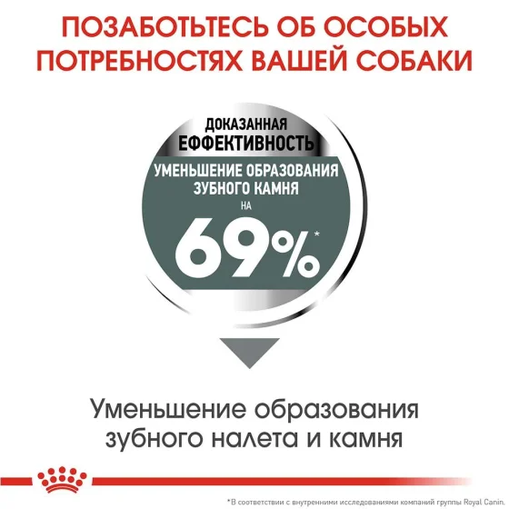 Уменьшение образования зубного камня на 69% * * Внутреннее исследование Royal Canin