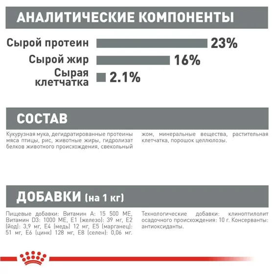 Кукурузная мука, дегидратированные протеины мяса птицы, рис, животные жиры, гидролизат белков животного происхождения, свекольный жом, минеральные вещества, растительная клетчатка, порошок целлюлозы.