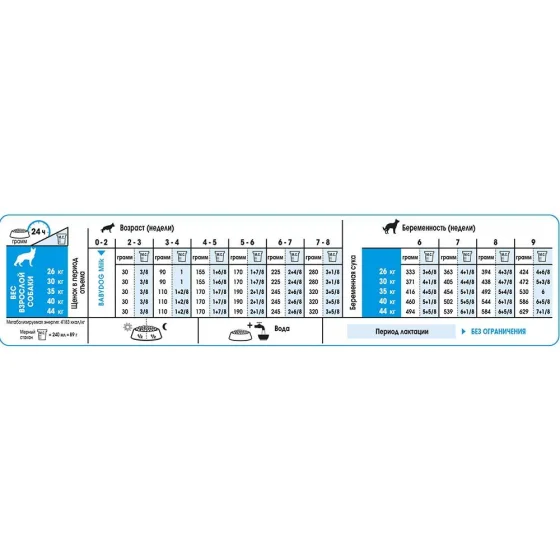 | 30 кг | Babydog Milk | 30 г (3/8) | 90 (1) | 155 г (1+6/8) | 170 г (1+7/8) | 225 г (2+4/8) | 280 г (3+1/8) |