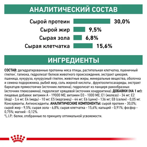 Дегидратированные протеины мяса птицы, растительная клетчатка, пшеничный глютен*, тапиока, гидролизат белков животного происхождения, экстракт цикория, пшеница, кукуруза, кукурузный глютен, животные жиры, минеральные вещества, оболочка и семена подорожника, рыбий жир, соль жирной кислоты, фруктоолигосахариды, экстракт бархатцев прямостоячих (источник лютеина), гидролизат из панциря ракообразных (источник глюкозамина), гидролизат хрящевой (источник хондроитина).