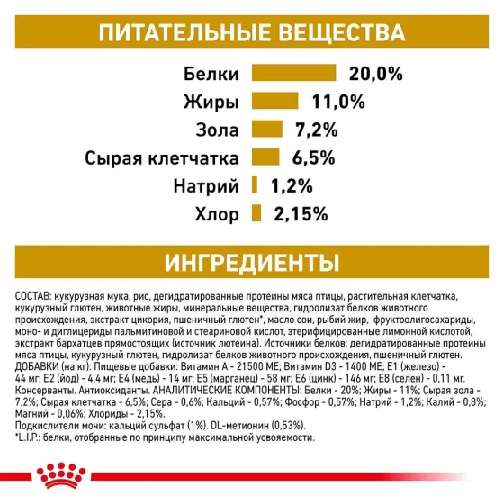 Кукурузная мука, рис, дегидратированные протеины мяса птицы, растительная клетчатка, кукурузный глютен, животные жиры, минеральные вещества, гидролизат белков животного происхождения, экстракт цикория, пшеничный глютен*, соевое масло, рыбий жир, фруктоолигосахариды, моно- и диглицериды пальмитиновой и стеариновой кислот, этерифицированные лимонной кислотой, экстракт бархатцев прямостоящих (источник лютеина). Источники протеинов: дегидратированные протеины мяса птицы, кукурузный глютен, гидролизат белков животного происхождения, пшеничный глютен.