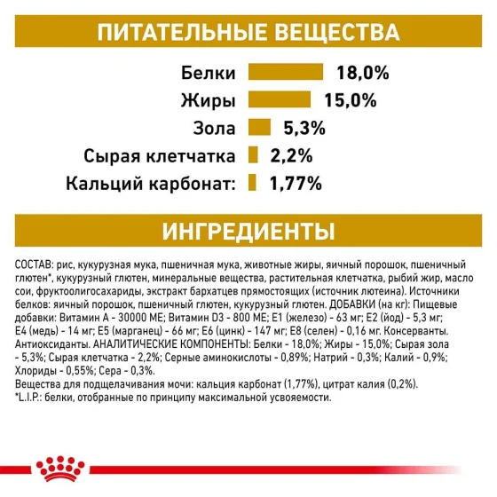 сырой протеин - 18,0%; сырой жир - 15,0%; сырая зола - 5,3%; сырая клетчатка - 2,2%; серные аминокислоты - 0,89%; натрий - 0,3%; калий - 0,9%; хлориды - 0,55%; сера - 0,3%. Вещества для ощелачивания мочи: кальций карбонат - 1,77%; цитрат калия - 0,2%.