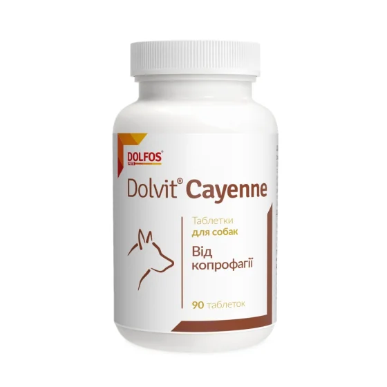 Dolfos Cayenne – дієтична добавка для собак, що допомагає при копрофагії (поїданні фекалій). Препарат нормалізує травлення, знижує ризик шлунково-кишкових розладів, зараження паразитами та передачі інфекційних хвороб. Добавка містить важливі компоненти для відновлення балансу речовин в організмі тварини.