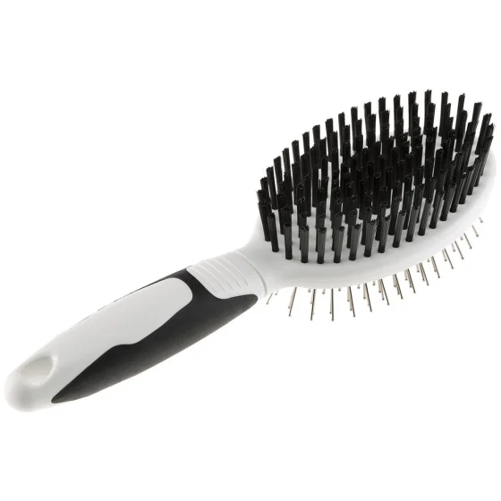 Ferplast GRO 5763 Premium — професійна двостороння щітка, призначена для котів і собак із короткою, середньою та довгою шерстю. Одна сторона має металеві зубці із заокругленими кінчиками для видалення підшерстка й забруднень, інша — м’яку нейлонову щетину, що надає шерсті блиску та доглянутого вигляду. Ергономічна ручка з м’яким протиковзким покриттям забезпечує комфорт навіть під час тривалого використання.