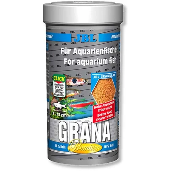 JBL Grana — основний корм преміум-класу у вигляді гранул для невеликих акваріумних риб. Збалансована формула з вітамінами, мінералами та натуральними інгредієнтами забезпечує повноцінне харчування, підтримує здоров’я, активність та красиве забарвлення риб. Гранули легко засвоюються та підходять для щоденного годування дрібних декоративних риб.