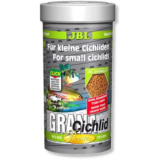 JBL GranaCichlid — основний корм преміум-класу у вигляді гранул для хижих цихлід. Збалансована формула з високим вмістом білка, вітамінів та мінералів забезпечує повноцінне харчування, підтримує здоров’я, активність та яскраве забарвлення риб. Гранули легко засвоюються та підходять для щоденного годування хижих цихлід усіх розмірів.
