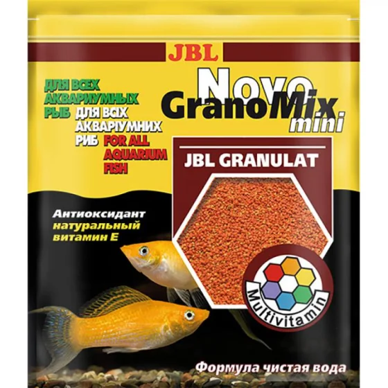 JBL NovoGranoMix mini — основний корм у вигляді міні-гранул для невеликих акваріумних риб. Збалансована формула з вітамінами, мінералами та натуральними інгредієнтами підтримує здоров’я, активність та красиве забарвлення риб. Міні-гранули легко засвоюються та підходять для щоденного годування дрібних декоративних видів.