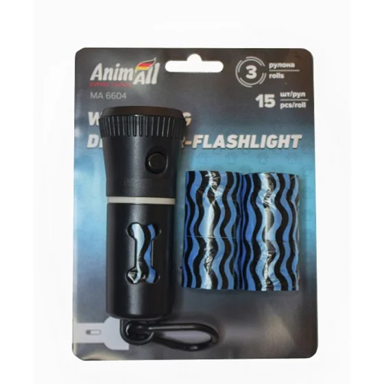 У наборі для прогулянок AnimAll є диспенсер під пакети для фекалій, зроблений у вигляді LED ліхтарика. Він не лише вирішить проблему зручного транспортування пакетів, а й висвітлить шлях у вечірній час. Ліхтарик оснащений карабіном, за допомогою якого його можна зафіксувати на поясі чи повідку. .