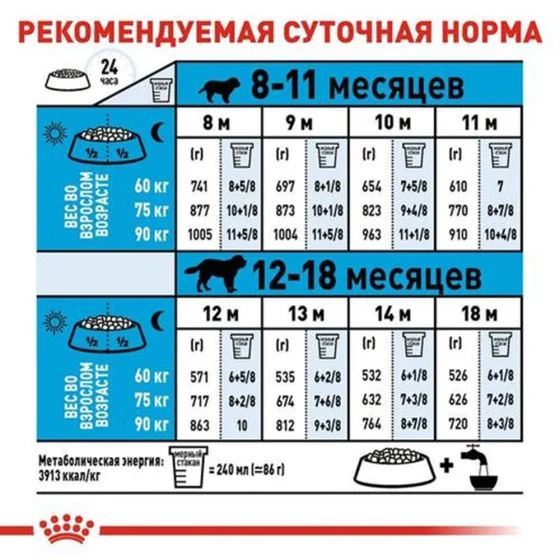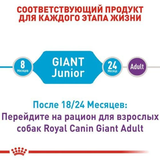 Повнораціонний корм для собак гігантських розмірів (вага дорослої тварини понад 45 кг) у віці від 8 до 18 або 24 місяців — залежно від породи.