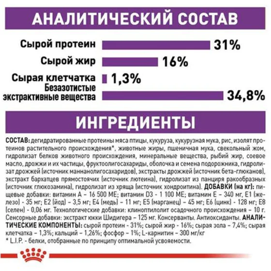 Дегідратовані протеїни м’яса птиці, пшеничний глютен*, рис, кукурудза, кукурудзяне борошно, тваринні жири, пшеничне борошно, буряковий жом, гідролізат протеїнів тваринного походження, мінеральні речовини, кукурудзяний глютен, соєва олія, дріжджові продукти, риб’ячий жир, фруктоолігосахариди, оболонка та насіння подорожника, гідролізат дріжджів (джерело мананоолігосахаридів та бета-глюканів) (0,30%), олія водоростей Schizochytrium (джерело ДГК), сік Юкки Шидигера, борошно чорнобривців прямостоячих, глюкозамін (ферментативного походження), гідролізат хряща (джерело хондроїтину).