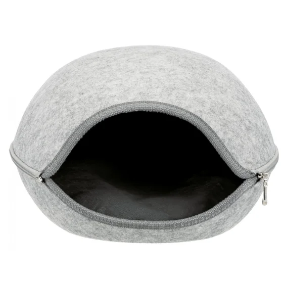 Лежак-печера Trixie Luna для котів, має форму черепашки і сірий колір. Призначений для котів. Зроблений з повсті. Стабільна форма. Застібка-блискавка по периметру для повного відкриття. Стьобані подушка з плюшевою кришкою (поліестер) і поліестерової флісовій набиванням. Все це створюють чудовий затишок для кішки і захист від протягів.