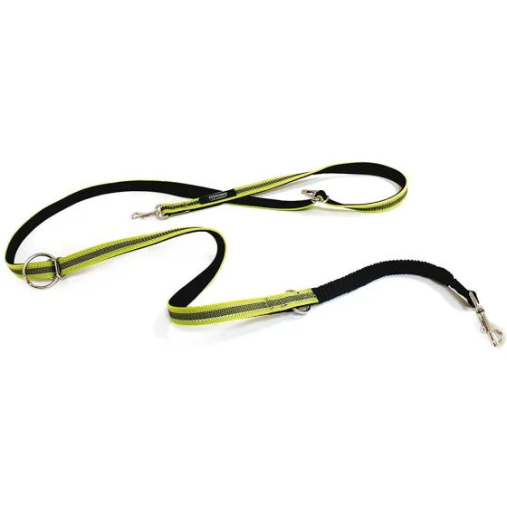 Три кільця дозволяють використовувати повідець як звичайний, плечовий або поясний, а світловідбиваючі вставки підвищують безпеку у темний час доби. М’яка неопренова підкладка та еластична петля на кінці забезпечують захист рук від ривків.