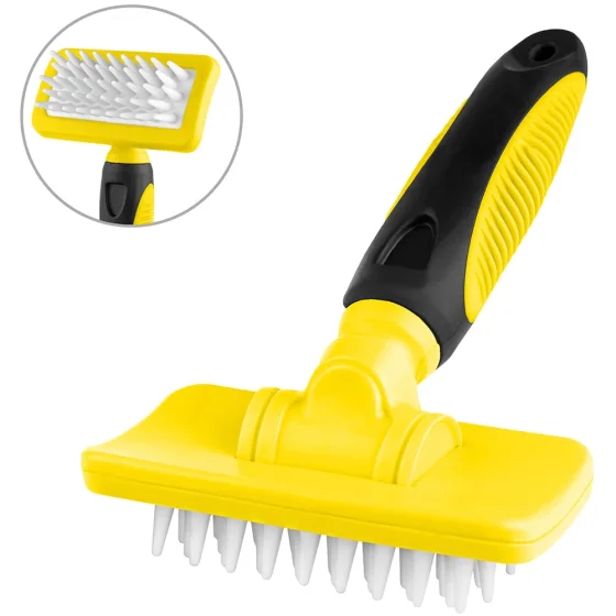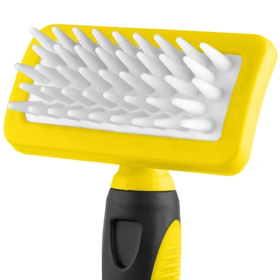 Інструмент оснащений пластиковою ручкою з покриттям проти ковзання для комфортного і ефективного використання. Щетинки акуратно видаляють випали волоски і лущення на шкірі, рівномірно розподіляють шкірний жир і підтримують блиск шерсті. При регулярному використанні сприяє контролю линьки і попереджає сплутування волосків вовни вихованця. Ідеально підходить для догляду за шерстю всім породам короткошерстих тварин.
