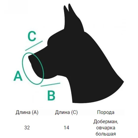 Намордник виготовлений для основних службових і мисливських порід собак, таких як німецька вівчарка (сука, пес), бельгійська вівчарка малінуа, доберман, сетер, піт-буль, стаффордширський тер'єр і собак з ідентичними формами і розмірами морди.