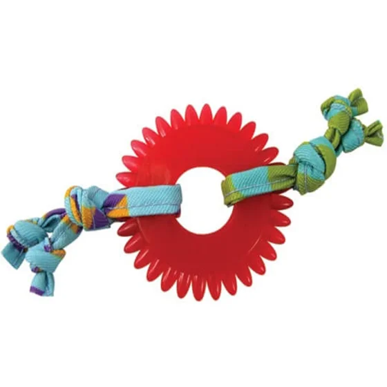 Стрічки прив’язані до колеса, роблять гру ще веселішою. Зазубрені краї допомагають очищувати зуби, а матеріал з якого виготовлене колесо зміцнює щелепи під час тренування.