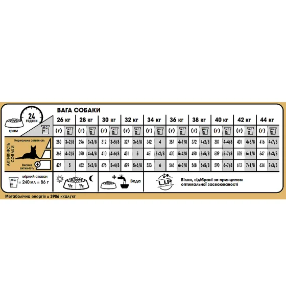| Вага собаки | Нормальна активність | Підвищена активність | Висока активність |