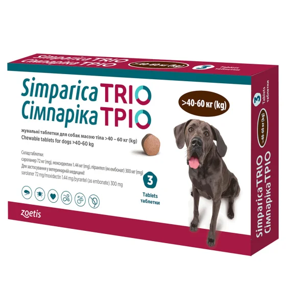 Жувальні таблетки Зоетіс Сімпаріка Тріо проти бліх та кліщів для собак вагою від 40 до 60 кг, ціна за 1 таблетку