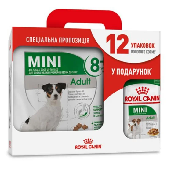 Сухий корм Royal Canin Mini Adult 8+ для собак дрібних порід, 4 кг + 12 паучів у подарунок