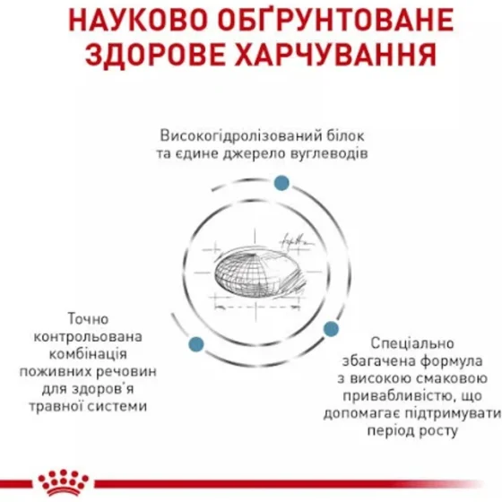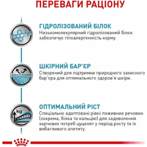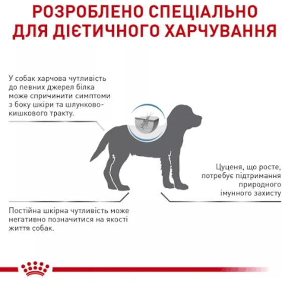 Полнорационная гипоаллергенная диета для щенков всех пород при пищевой аллергии/непереносимости. Также рацион рекомендуют при хронических дерматозах,сопровождающихся кожным зудом.