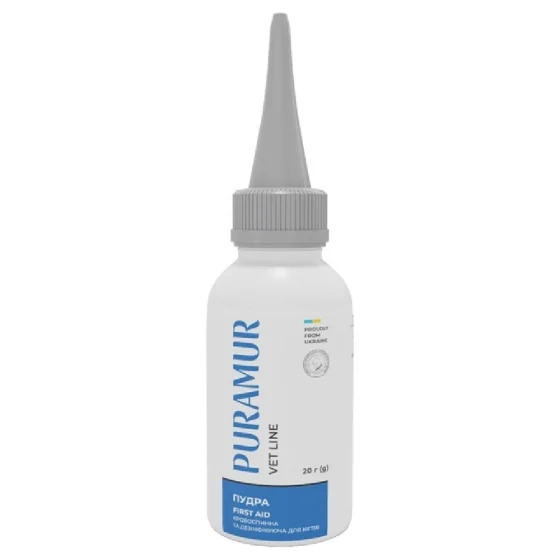 Пудра Puramur First Aid призначена для для швидкої зупинки невеликої капілярної кровотечі в процесі стрижки кігтів вихованця, а також для обробки дрібних капілярних порізів у собак, котів та інших дрібних тварин.