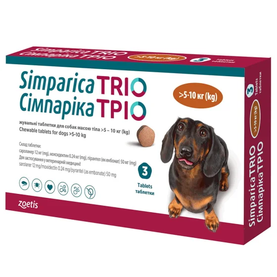 Жувальні таблетки Zoetis Сімпарика Тріо проти бліх та кліщів для собак вагою від 5 до 10 кг (ціна за упаковку)