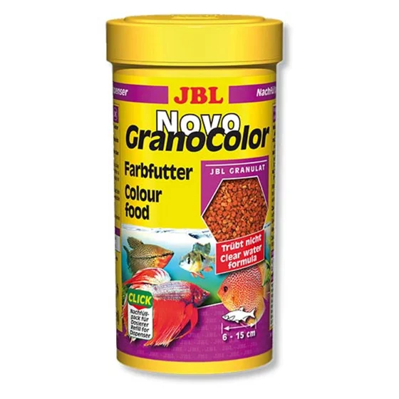 JBL NovoGranoColor — корм у вигляді гранул для середніх і великих акваріумних риб, спеціально розроблений для посилення яскравого забарвлення. Містить природні барвники, вітаміни та мінерали для підтримки здоров’я, активності та красивого вигляду риб. Гранули повільно тонуть, що забезпечує природний спосіб годування.