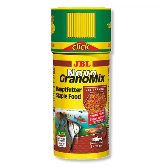 JBL NovoGranoMix Click — повноцінний корм для всіх видів акваріумних риб у вигляді різнокольорових гранул. Поставляється у зручній банці з дозатором, що дозволяє точно контролювати порцію та запобігати перекорму. Містить збалансований комплекс білків, вітамінів та мінералів для підтримки здоров’я, активності та яскравого забарвлення риб.