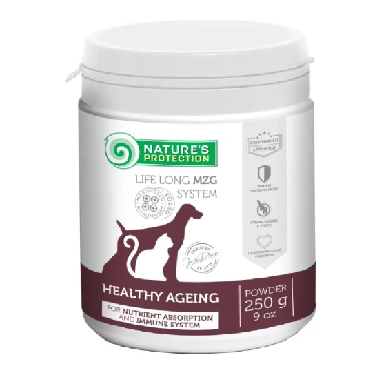 Харчова добавка Nature's Protection Healthy Ageing Formula призначена для котів і собак старшого віку. Спеціальна формула підтримує здоров’я зубів, кісток і суглобів, допомагає знизити вікові зміни та зберегти активність улюбленця. Містить глюкозамін, хондроїтин, кальцій і вітаміни, необхідні для опорно-рухового апарату.