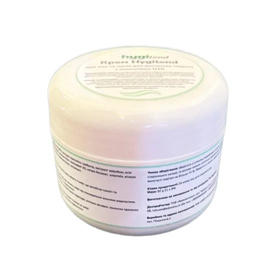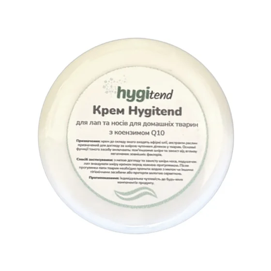 HygiTend Cream – це живильний та захисний крем для лап та носа домашніх тварин, збагачений коензимом Q10. Засіб зволожує, пом’якшує та захищає шкіру від тріщин, подразнень та сухості, підтримуючи здоров’я лап та носа улюбленця в будь-який час року.