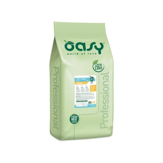 Повноцінний та збалансований корм, який задовольняє енергетичні потреби цуценяти та підтримує його здоровий ріст. Збагачений усіма необхідними поживними речовинами та енергією. Ідеально підходить для маленьких шлунків та ротиків! Маленькі гранули висока енергіїя Оasy Puppy & Junior Small Chicken ідеально підходять для ротової порожнини та шлунку маленьких цуценят. Вони багаті енергією, яка підтримує швидкий ріст маленьких цуценят, залишаючи їх активними та жвавими. Цикорій є природним джерелом ФОС (фруктоолігосахаридів), які сприяють правильному травленню. Екстракт юки допомагає контролювати неприємний запах випорожнень. Буряковий жом є чудовим джерелом клітковини і сприяє регулярній роботі кишечника. Високоякісні тваринні білки допомагають формувати та підтримувати м'язову масу. Відповідне споживання жирів допомагає забезпечити необхідну кількість енергії під час росту цуценяти. Кальцій і фосфор є основними елементами для розвитку кісток та суглобів. 42% тваринних інгредієнтів До складу Oasy входить щонайменше 42% свіжих, зневоднених та гідролізованих продуктів тваринного походження 1-й інгредієнт Свіже м'ясо Свіже м'ясо завжди є першим інгредієнтом, що забезпечує високу засвоюваність, вміст поживних речовин та смакові якості. Технологія F.M.I.S. Гарантує оптимальне збереження поживних речовин у свіжому м'ясі.