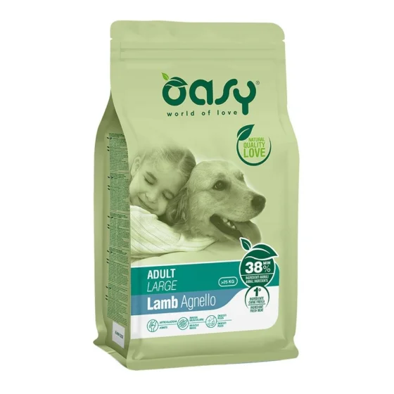 Повноцінний та збалансований корм, який допомагає підтримувати сильну та суху м'язову масу, а також здоров'я та рухливість суглобів завдяки спеціальним поживним речовинам, що входять до складу Oasy Adult Large. Крім того, ягнятина, що міститься в кормі, є чудовим джерелом тваринного білку, який легко засвоюється і добре підходить для собак з чутливим травленням. Кальцій, фосфор і вітамін D3 є основними елементами для здоров'я кісток і суглобів. Для собак великих порід особливо важливо захищати суглобовий хрящ і кісткову структуру, оскільки вони тримають найбільшу вагу. М'язова маса Високоякісні білки, що містяться в Oasy, мають високу біологічну цінність і є основою для розвитку сильної та сухої м'язової маси у собак великих порід. Ягнятина - чудове джерело високозасвоюванного тваринного білку, яке добре підходить навіть для собак з підвищеною чутливістю до їжі.
