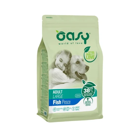 Повноцінний та збалансований корм, який допомагає підтримувати сильну та суху м'язову масу, а також здоров'я та рухливість суглобів завдяки спеціальним поживним речовинам, що входять до складу Oasy Adult Large. Крім того, риба, що міститься в кормі, є чудовим джерелом тваринного білку, який легко засвоюється і добре підходить для собак з чутливим травленням. Цикорій є природним джерелом FOS (фруктоолігосахаридів), які разом з MOS (маннанолігосахаридами) сприяють правильному травленню. Екстракт юки допомагає контролювати неприємний запах фекалій. Буряковий жом є чудовим джерелом клітковини і сприяє регулярній роботі кишечника. Кальцій, фосфор і вітамін D3 є основними елементами для здоров'я кісток і суглобів. Для собак великих порід особливо важливо захищати суглобовий хрящ і кісткову структуру, оскільки вони тримають найбільшу вагу. М'язова маса Високоякісні білки, що містяться в Oasy, мають високу біологічну цінність і є основою для розвитку сильної та сухої м'язової маси у собак великих порід. До складу Oasy входить щонайменше 38% свіжих, зневоднених та гідролізованих продуктів тваринного походження. Свіже м'ясо завжди є першим інгредієнтом, що забезпечує високу засвоюваність, вміст поживних речовин та смакові якості.