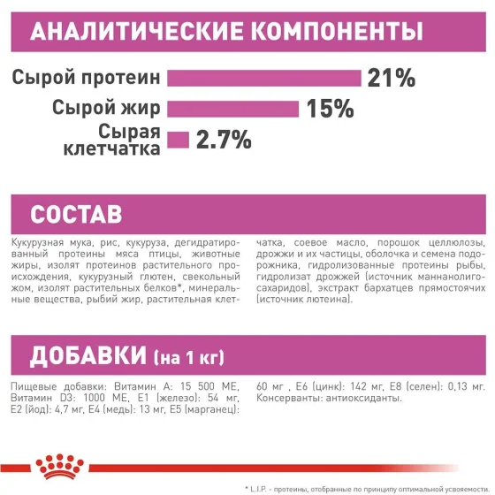 Кукурудзяне борошно, рис, кукурудза, дегідратовані протеїни м'яса птиці, тваринні жири, ізолят протеїнів рослинного походження, кукурудзяний глютен, буряковий жом, ізолят рослинних білків*, мінеральні речовини, риб'ячий жир, рослинна клітковина, соєва олія, порошок целюлози, дріжджі та їхні частки, оболонка та насіння подорожника, гідролізовані протеїни риби, гідролізат дріжджів (джерело маннанолігосахаридів), екстракт чорнобривців прямостоячих (джерело лютеїну).
