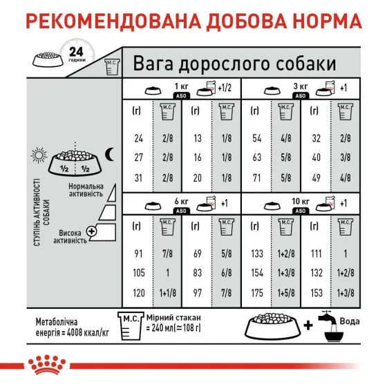 ВагаПомірна активністьСухий корм+павукПідвищена активність Сухий корм+павук1 кг24 2/813 1/8 + 1/227 2/816 1/8+1/2+ 13 кг54 4/8 32 2/8+ 163 5/840 3/8+ 16 кг91 7/869 5/8+1105 183 6/8 + 110 кг133 1+2/8111 1 +1154 1+3 /8132 1+2/8 + 1